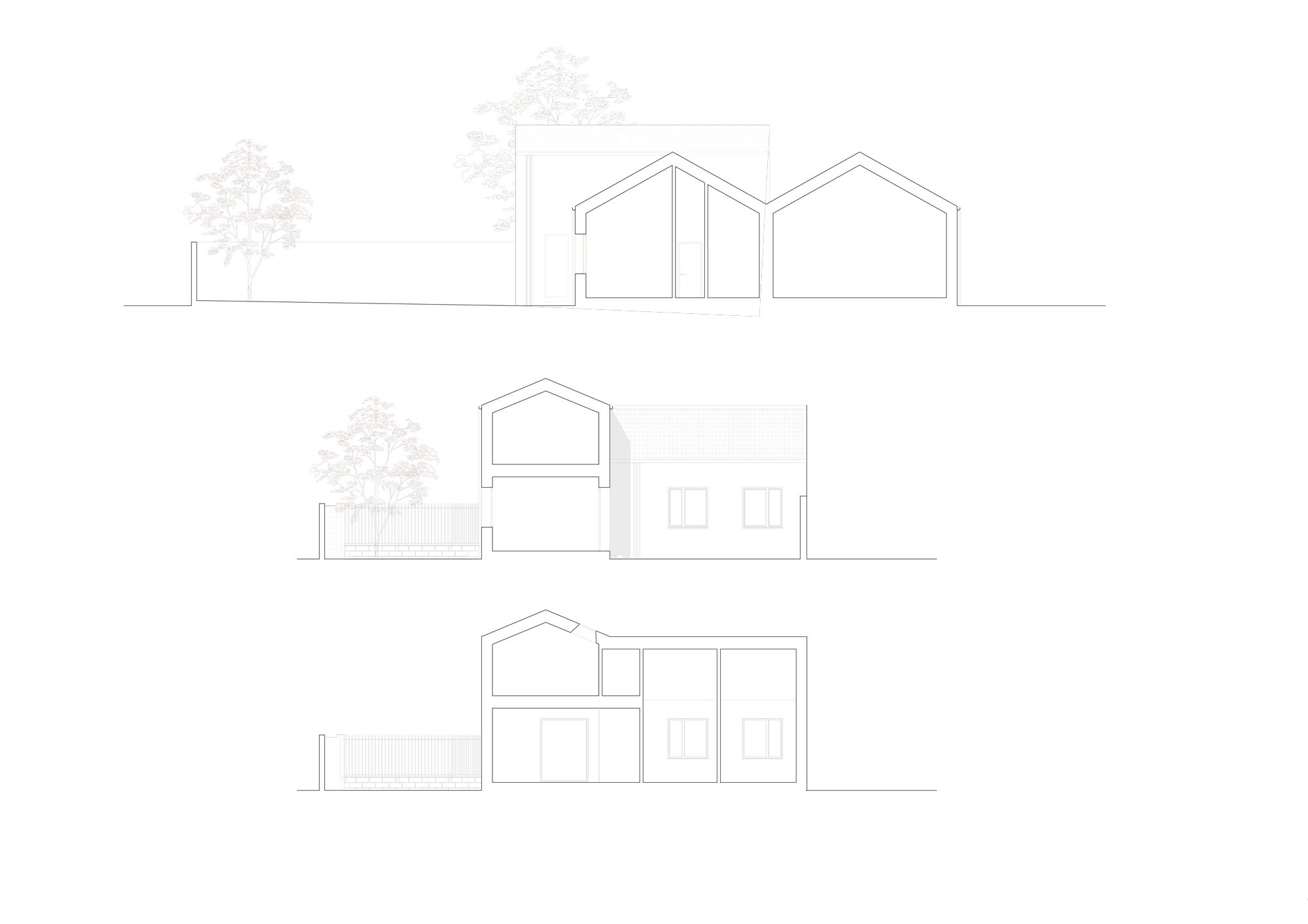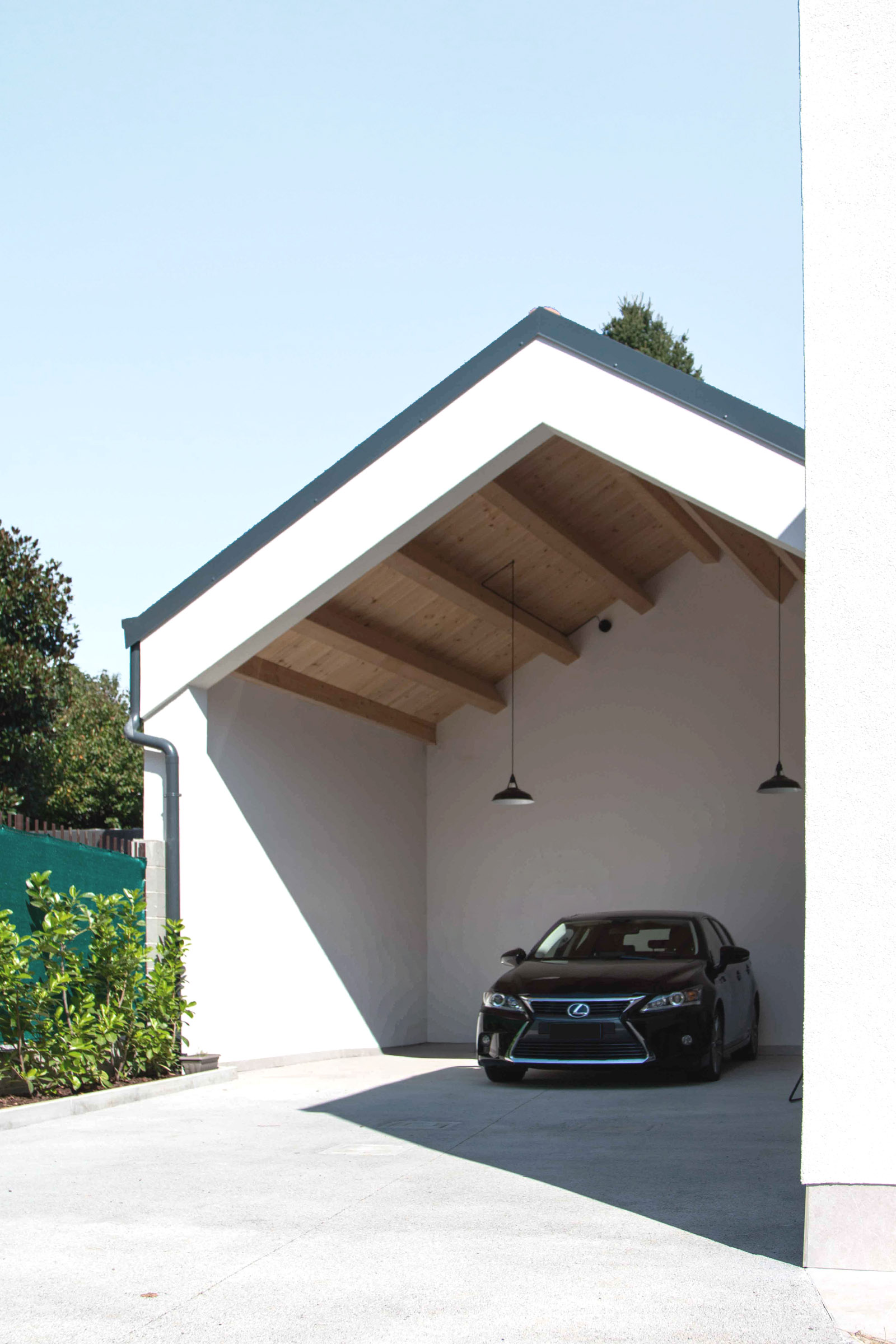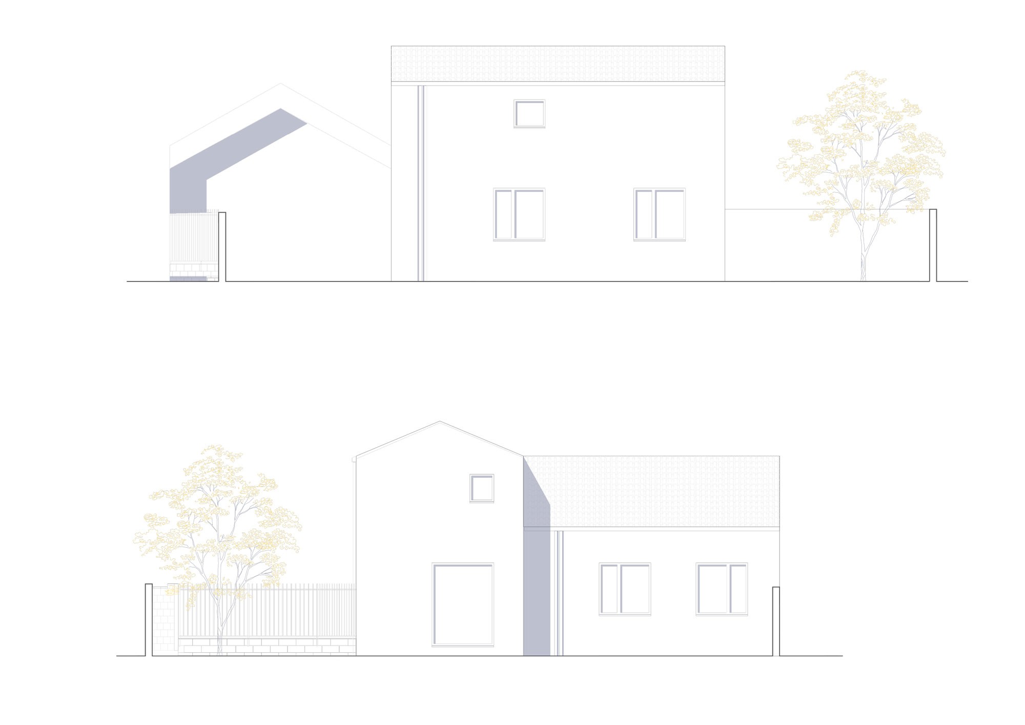 La trasformazione più significativa riguarda l’introduzione di un secondo corpo di fabbrica, concepito come naturale evoluzione dell’edificio originario. Questo nuovo volume, dotato anch’esso di copertura a due falde, si eleva oltre l’altezza preesistente e si dispone ortogonalmente rispetto al corpo originario, definendo una composizione più dinamica e articolata. Il diverso orientamento permette di massimizzare gli affacci, favorire l’ingresso della luce naturale e costruire un rapporto più equilibrato con il giardino e gli spazi aperti del lotto.